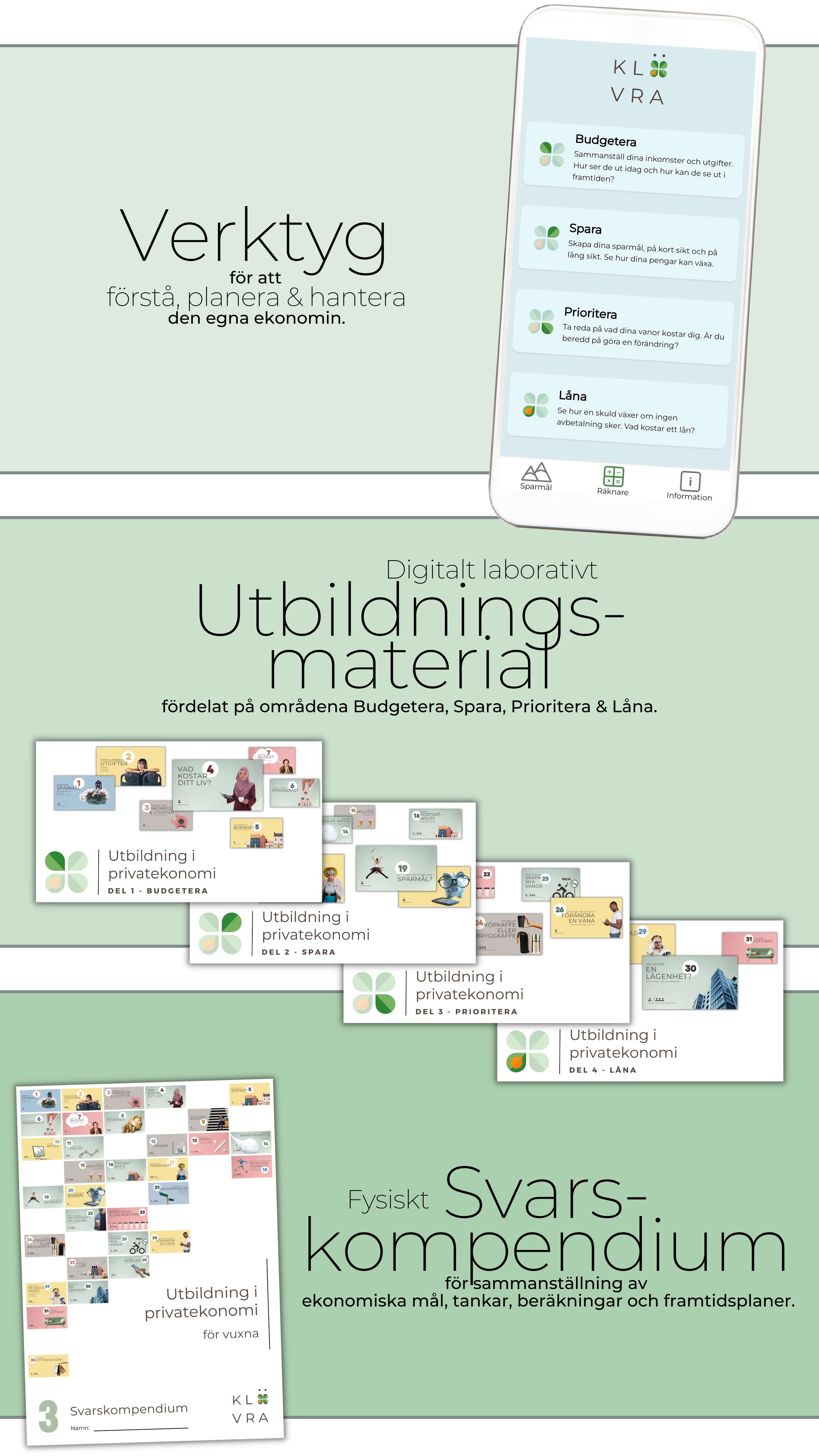 Privatekonomi drabbar alla samhällsmedborgare, oavsett socioekonomisk bakgrund, val av yrke eller plats i livet. Därför erbjuder Klövra ett material för grundläggande utbildning i privatekonomi riktad till vuxna. Fokus ligger på områdena: Budgetera, Spara, Prioritera och Låna.